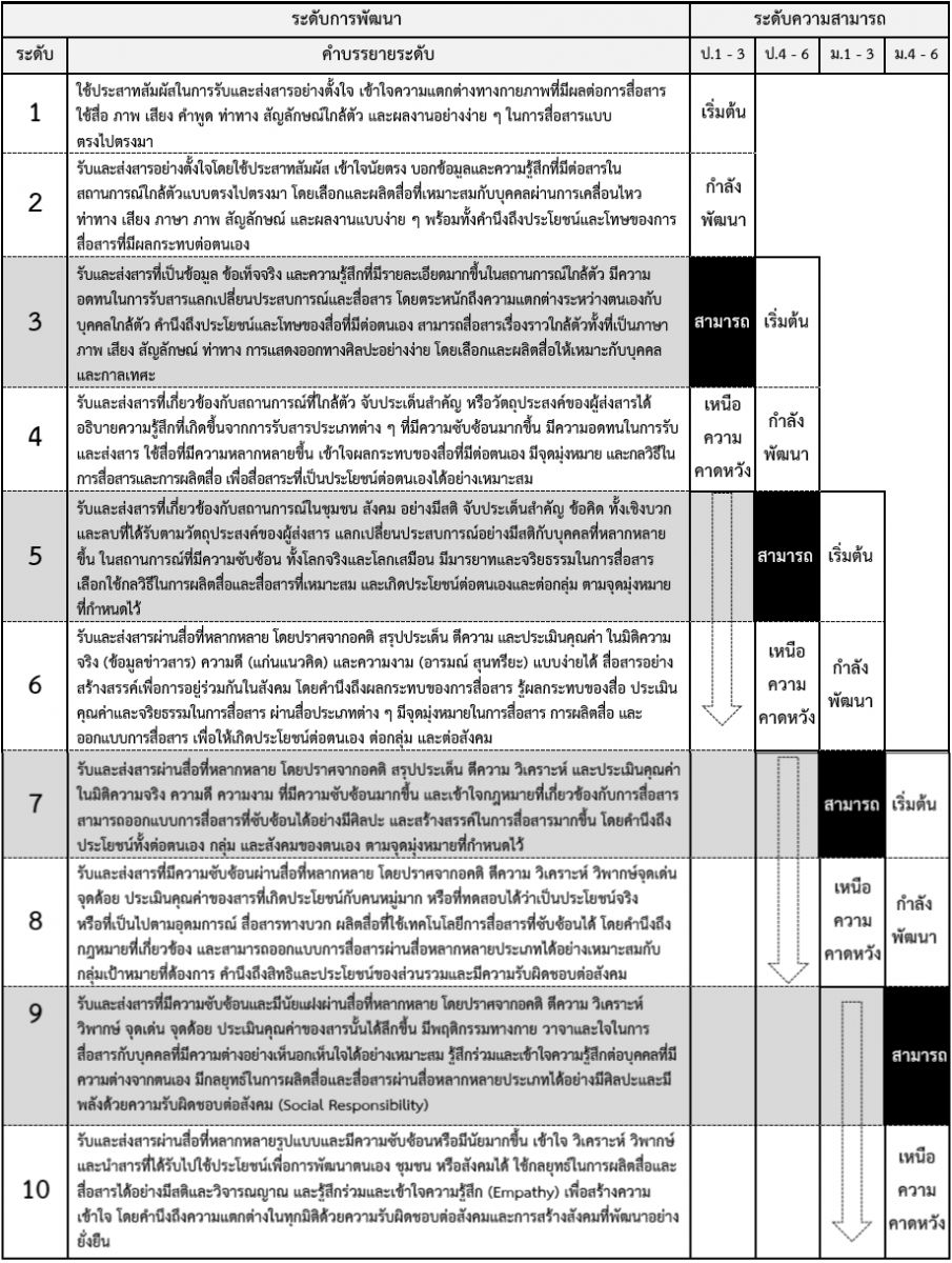 มีความสามารถรับรู้ รับฟัง ตีความ และส่งสารด้วยภาษาต่าง ๆ ทั้งวัจนภาษาและอวัจนภาษา โดยใช้กระบวนการคิด ซึ่งจะนำไปสู่การเรียนรู้ ความเข้าใจ ในระบบคุณค่า การแก้ปัญหาร่วมกันผ่านกลวิธีการสื่อสาร อย่างฉลาดรู้ สร้างสรรค์ มีพลัง โดยคำนึงถึงความรับผิดชอบต่อสังคม
