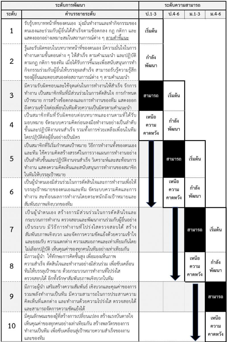 เป็นสมาชิกทีมที่ดีและมีภาวะผู้นำ มีทักษะการทำงานเป็นทีม รับผิดชอบในบทบาทหน้าที่ของตนและของทีม มีความยืดหยุ่นในการทำงานร่วมกับกลุ่มคนที่แตกต่าง นำจุดเด่นของตนและสมาชิกมาใช้ ในการทำงานให้บรรลุเป้าหมาย สะท้อนการทำงานของตนเองและทีม ส่งเสริมและพัฒนาศักยภาพของทีม สร้างแรงบันดาลใจในการพัฒนาตนเอง ให้เป็นที่ยอมรับและไว้วางใจ ประสานความร่วมมือภายในทีม และระหว่างทีม สร้างค่านิยมใหม่ในการทำงานร่วมกัน และการพัฒนาทีมที่เข้มแข็ง สามารถเป็นต้นแบบผู้สร้างการเปลี่ยนแปลง